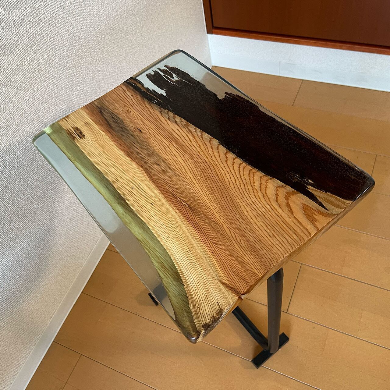 木材の温かみとレジンの美しい水色が融合したリバーテーブルです。
